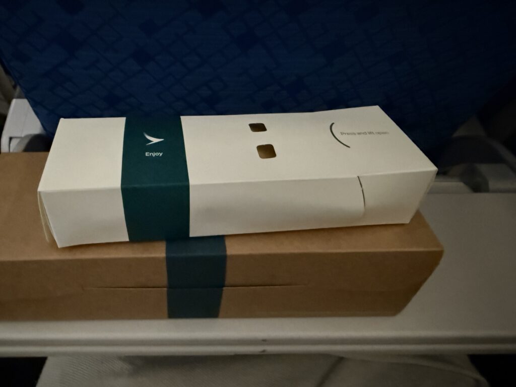 離陸したらすぐに機内食あり。さすがに深夜だし、このような軽食。食欲なしで食べるに終わる