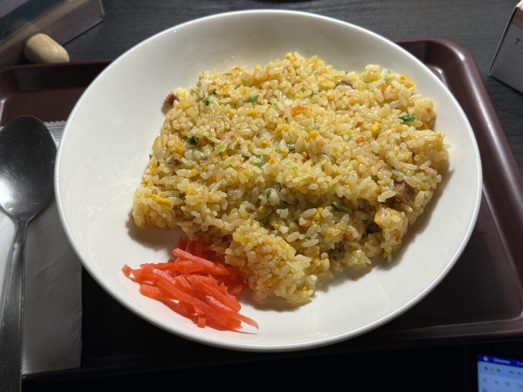 レンチンでしっとりしたチャーハンですが、味は悪くない。焼肉だれ風味