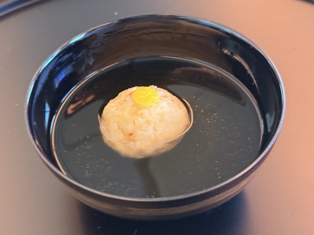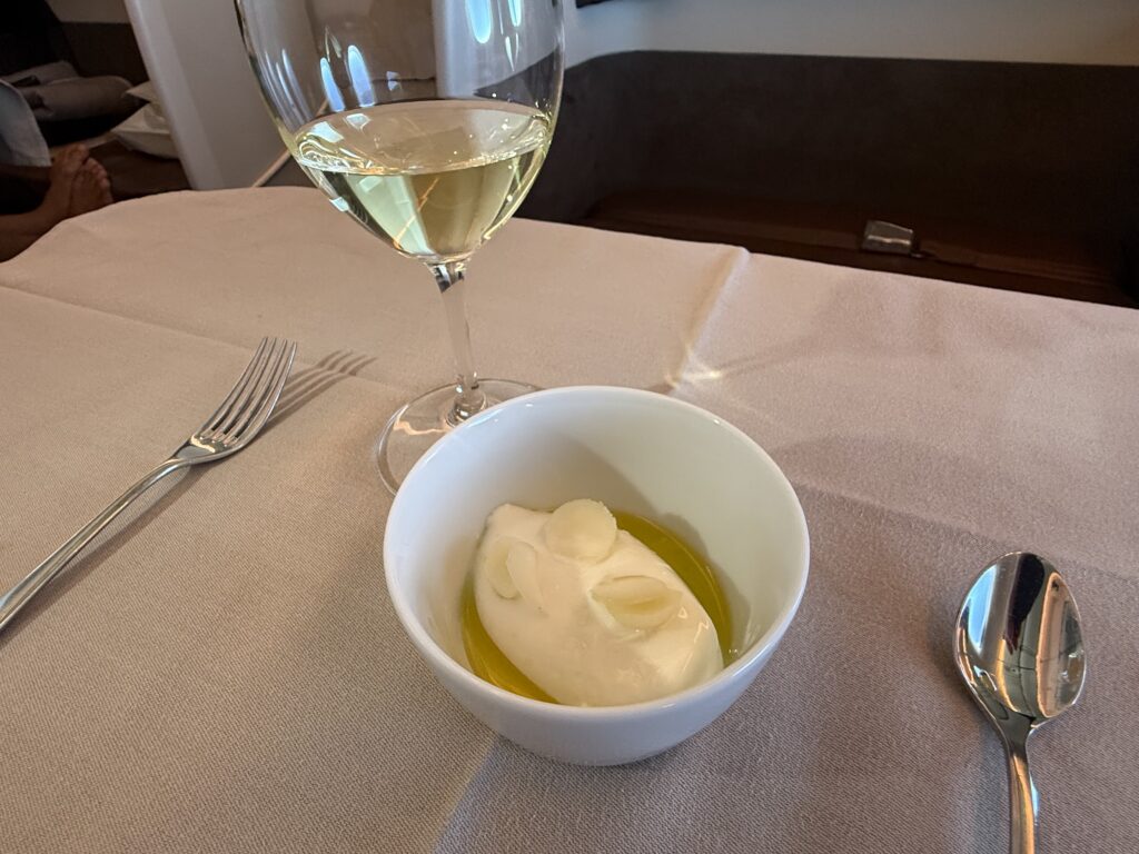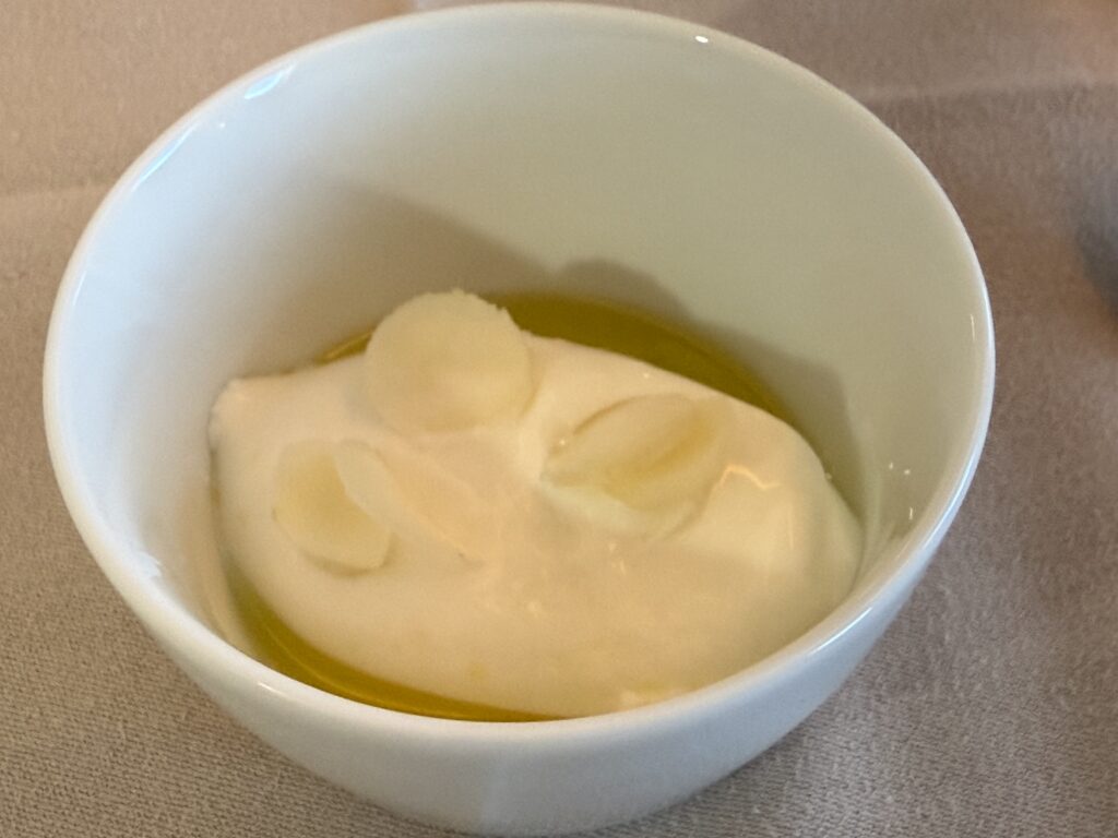 山羊のミルクはすごくコクがあって、しかもまろやかで洗練されとる。そしてオリーブオイルと塩のシンプルな味付け。白いのは蓮の実かしら。さすがシグネチャーメニュー