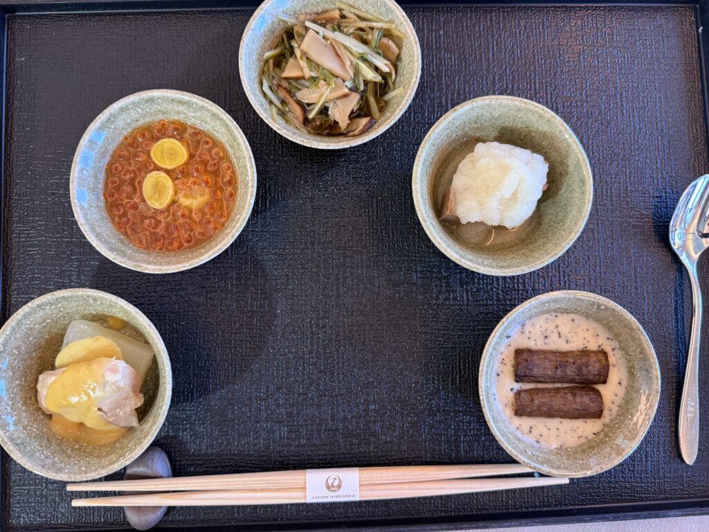 和食の前菜5品が運ばれました。ミシュラン星付き店の品の数々は贅沢