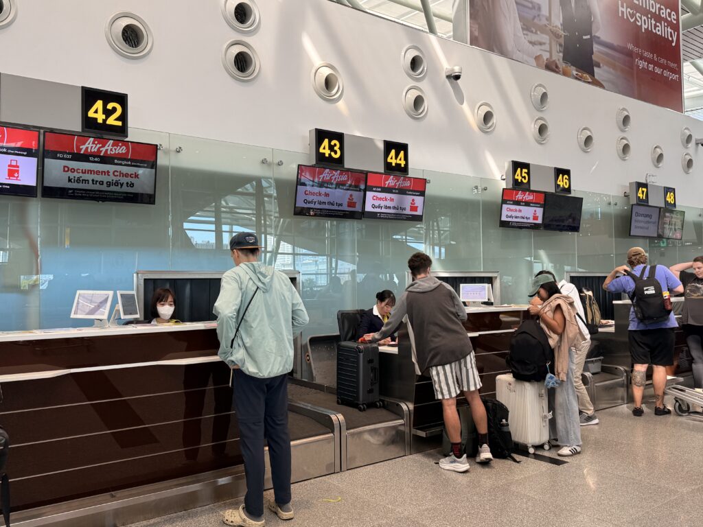 チェックインカウンターでチェックインします。エアアジアはカウンターごとに行先が異なりますので、表示版をよくみて列に並びました。