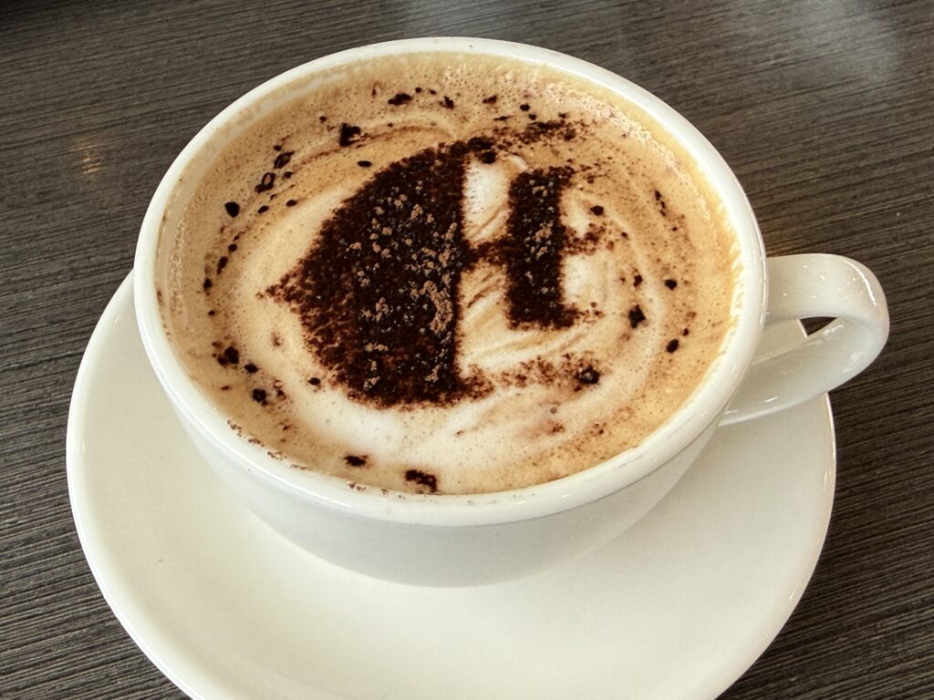 カフェラテをお願いしたら、マレーシア航空のラテアートでした