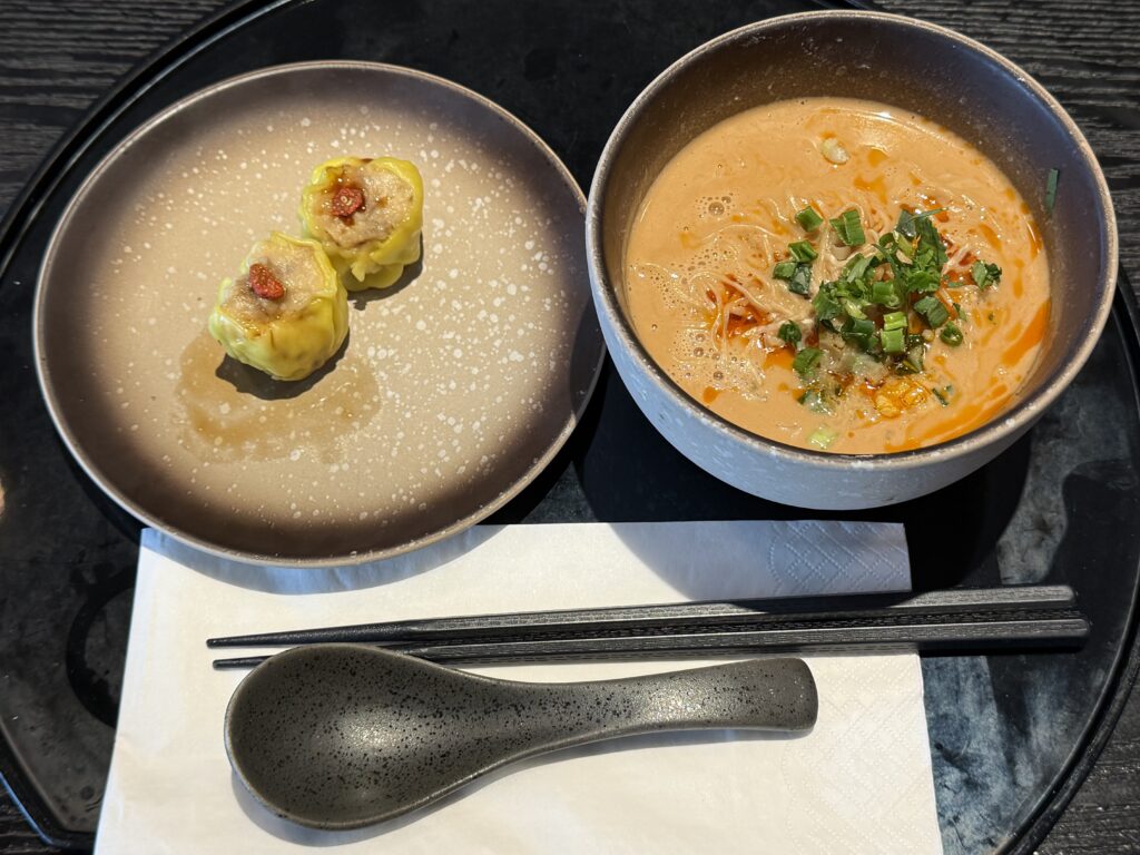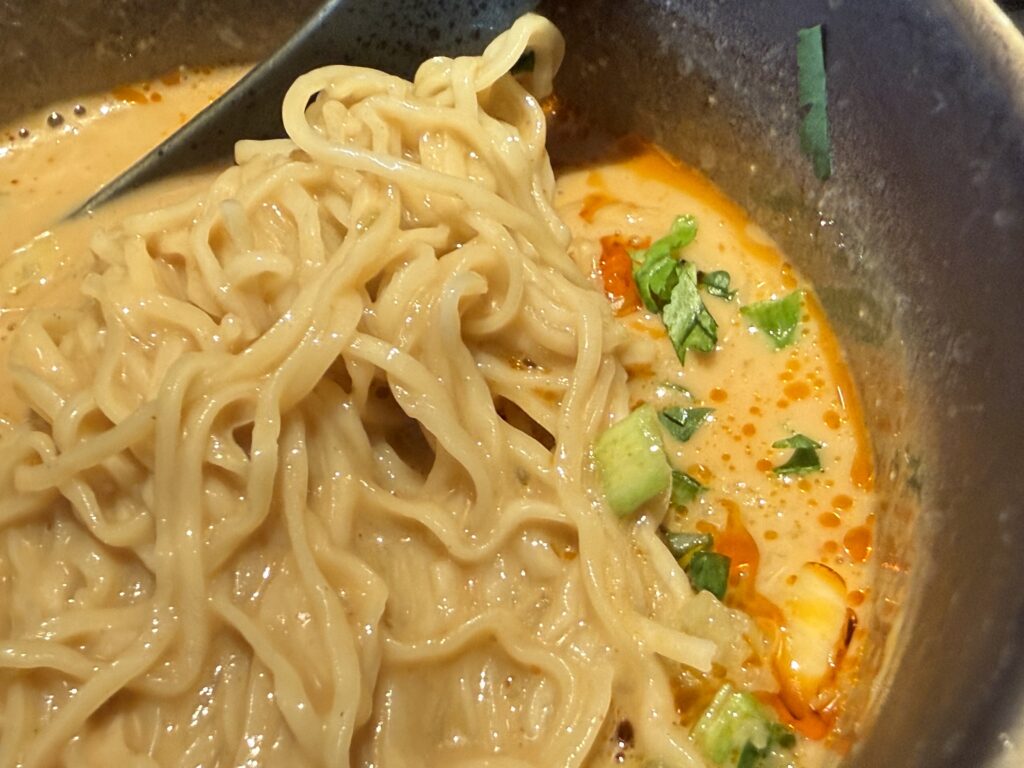担々麺。ぬるいスープに熱々の麺のとりあわせが素晴らしい