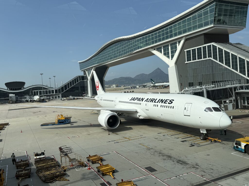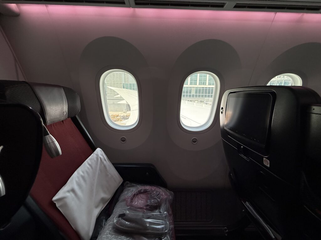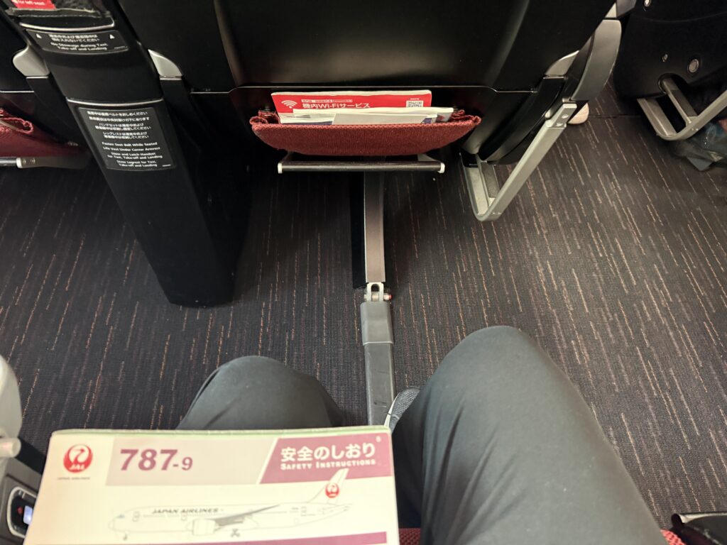 ボーイング787-9。プレミアムエコノミーですもの。足元はかなりゆったり