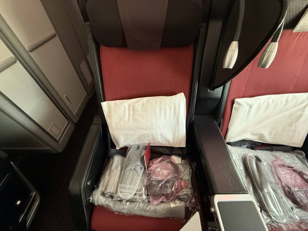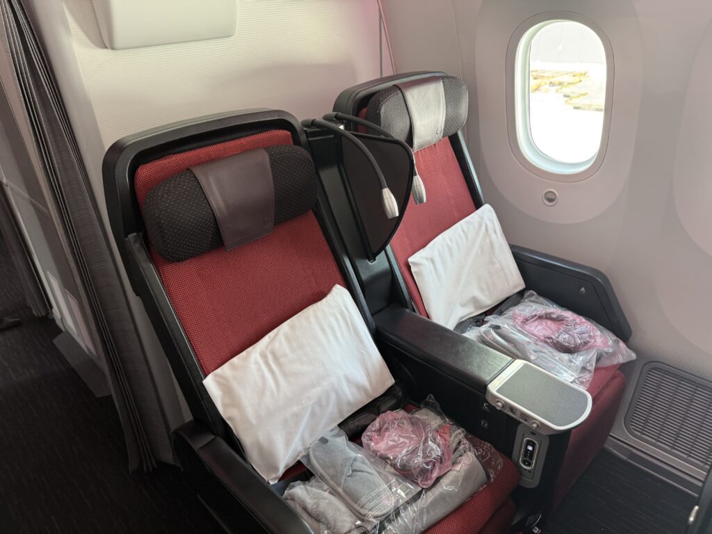 こちらの座席へ。今回もまたプレミアムエコノミーにアップグレードされています