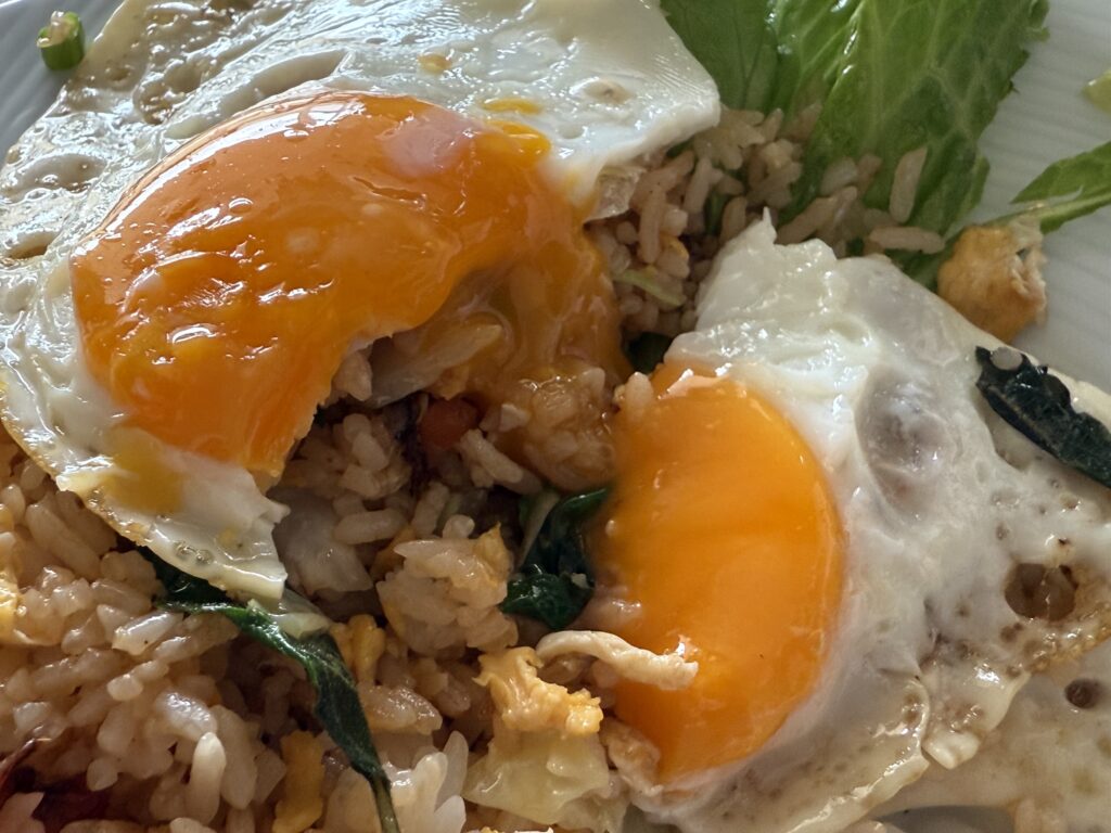 目玉焼きをどけてみると海老がたくさんで、一緒に炒めてあるガパオ(ホーリーバジル)も確認できます。