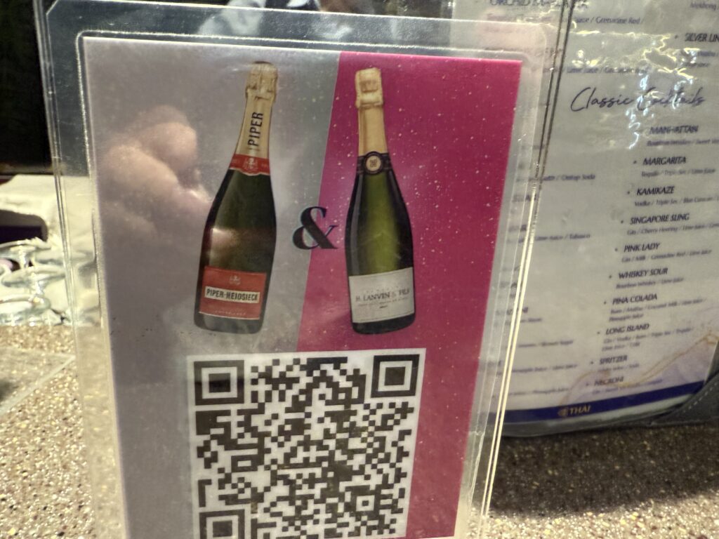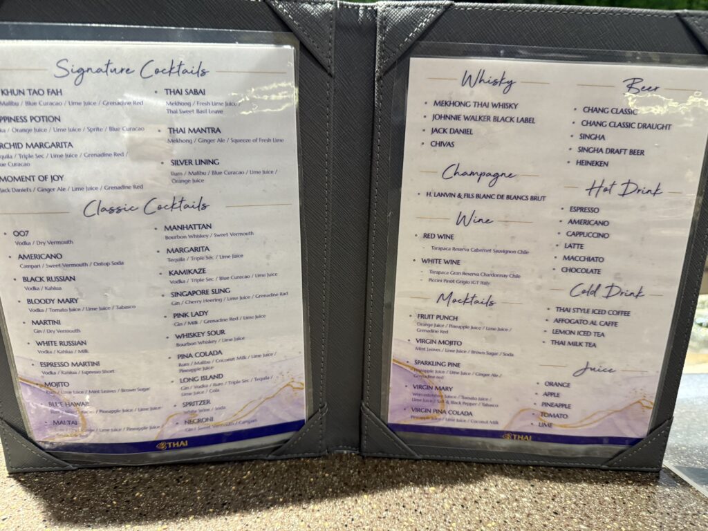 飲み物メニュー。タイ航空のビジネスラウンジで、シャンパンが飲めるとは知らなんだ