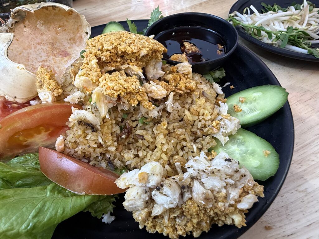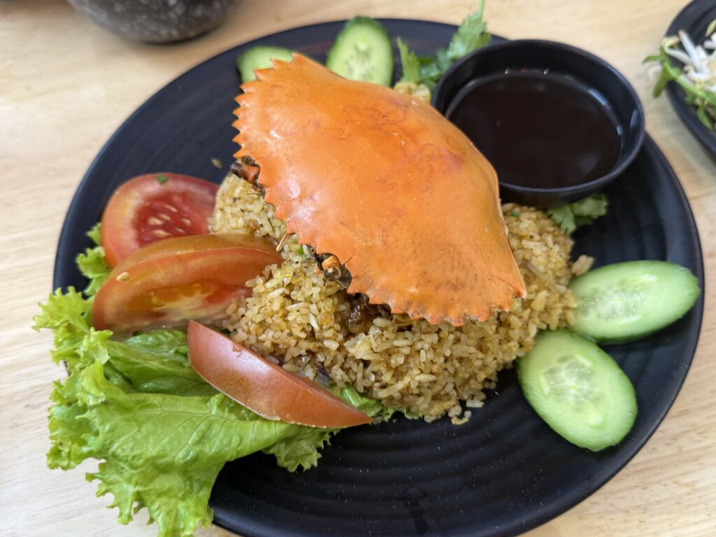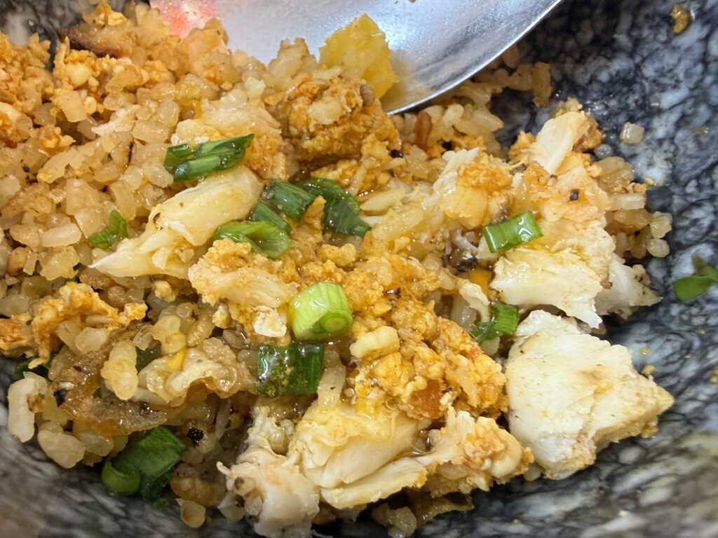 前日のチャーハンにくらべて色黒、しかしお米が砕けていないため昨日よりもおいしい。蟹肉もたくさん入っていました
