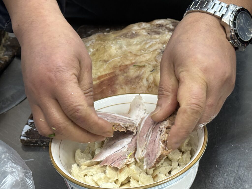 おじさんが羊肉のかたまりから手切りして、どんぶりの中に