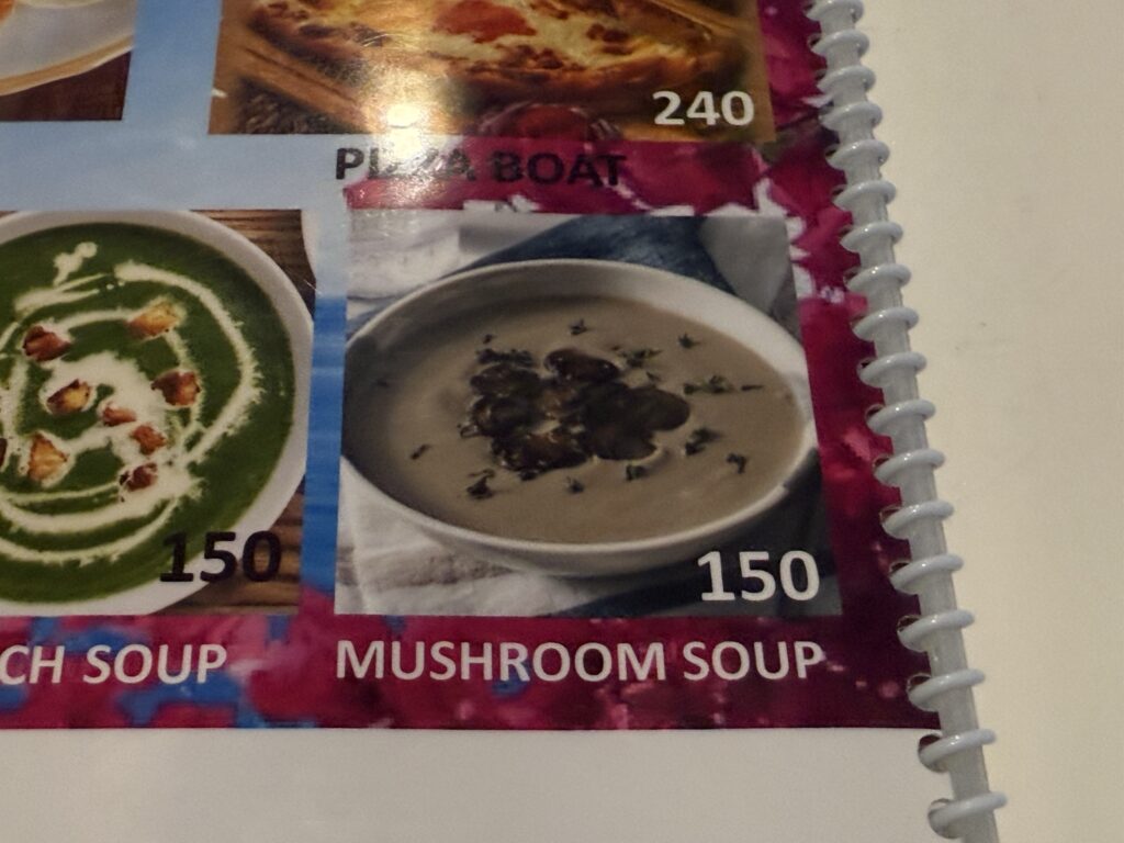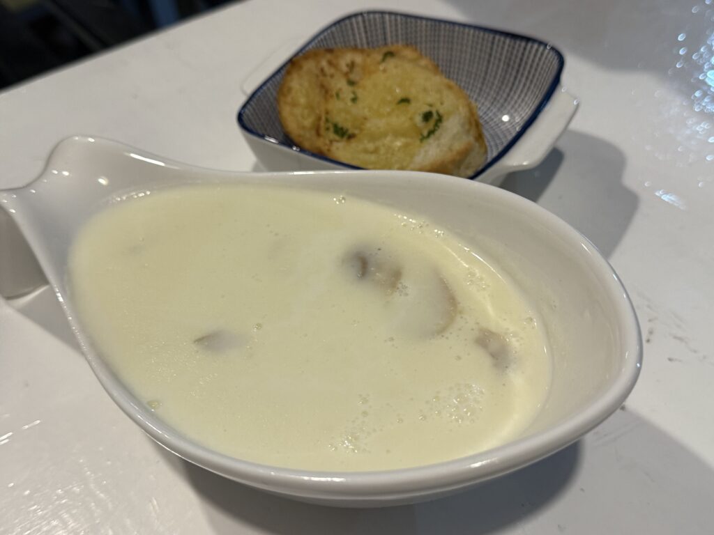 マッシュルームスープが運ばれましたが、メニューと色がぜんぜん違う。クリームスープにマッシュルームを浮かべただけ。なんだこりゃ