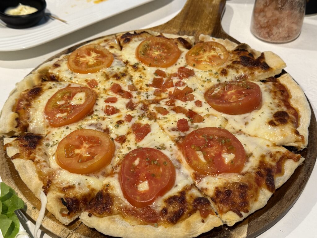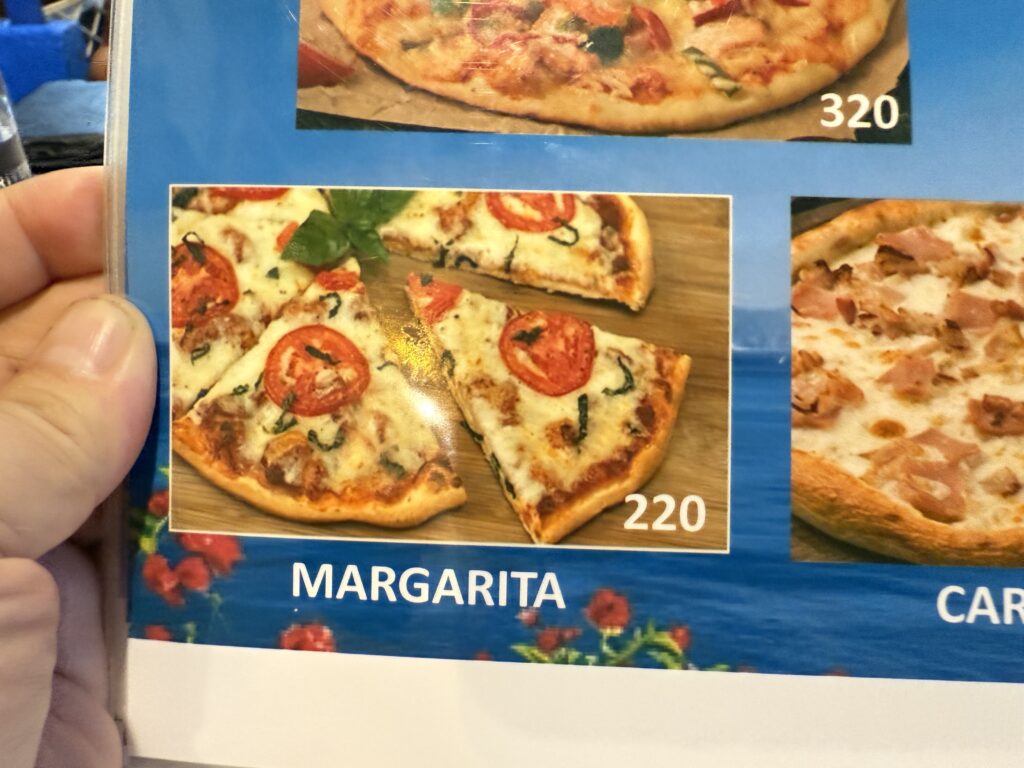 そしてマルゲリータピザも来る。チーズ過剰のピザ。生地はもちもち感がなく、おそらく冷凍もの
