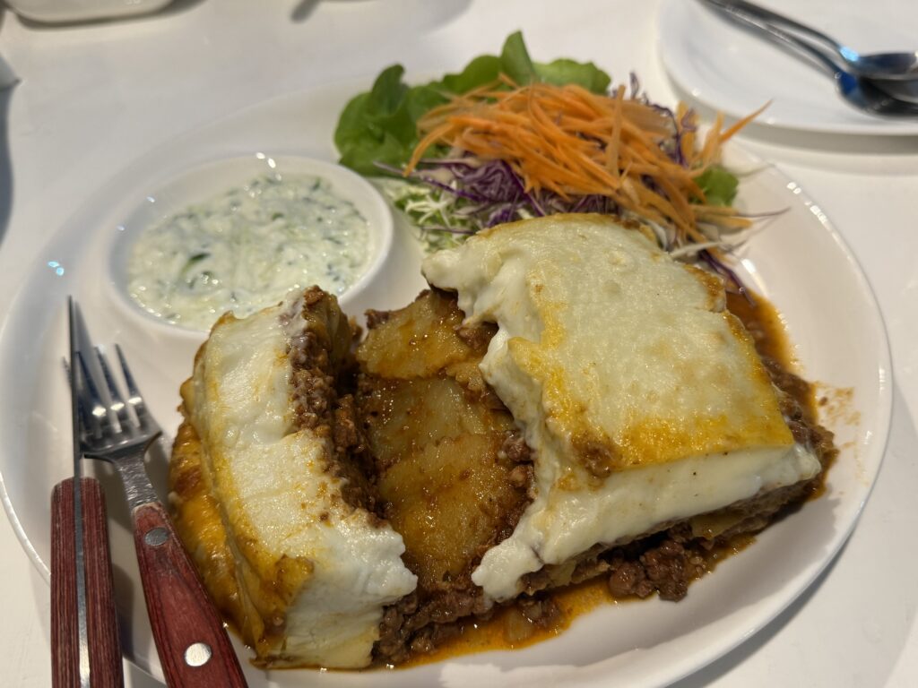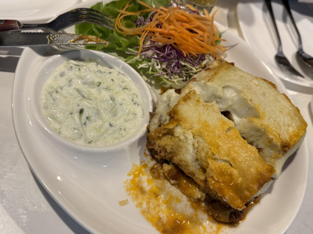 ムサカがはこばれましたが、ぜんぜん茄子感がなく、マッシュポテトばっかり目立つ味。