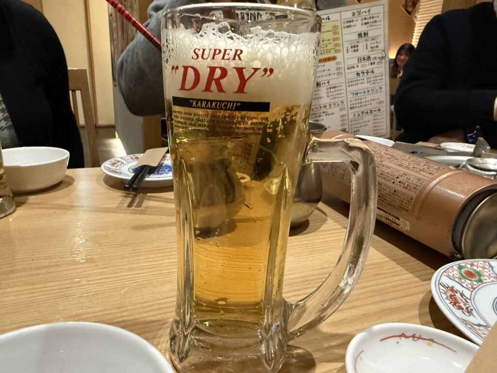 スーパードライで乾杯。あまりおいしくない生ビールだ