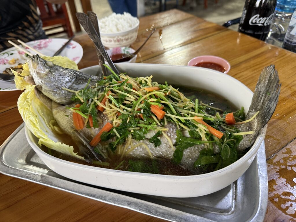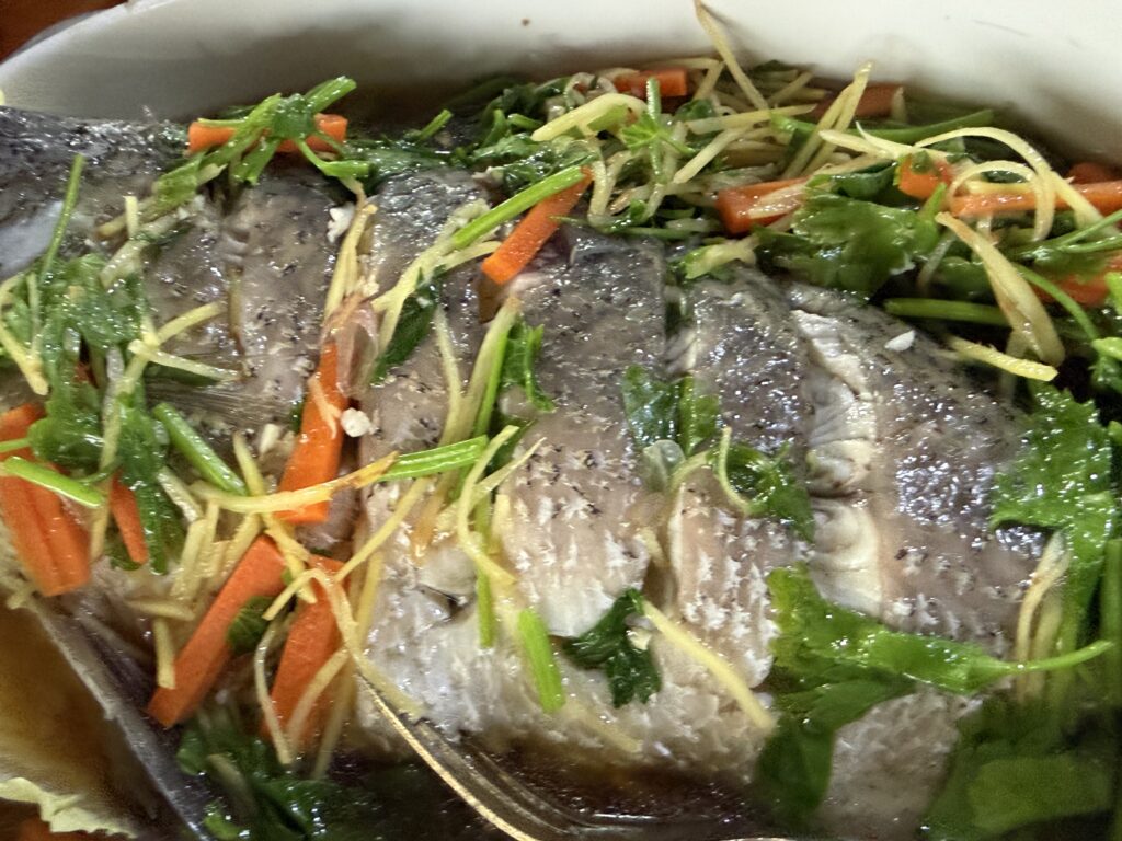 脂ののった大きめのスズキを蒸したもの。ものすごくおいしい。やっぱ新鮮な魚はいいです。