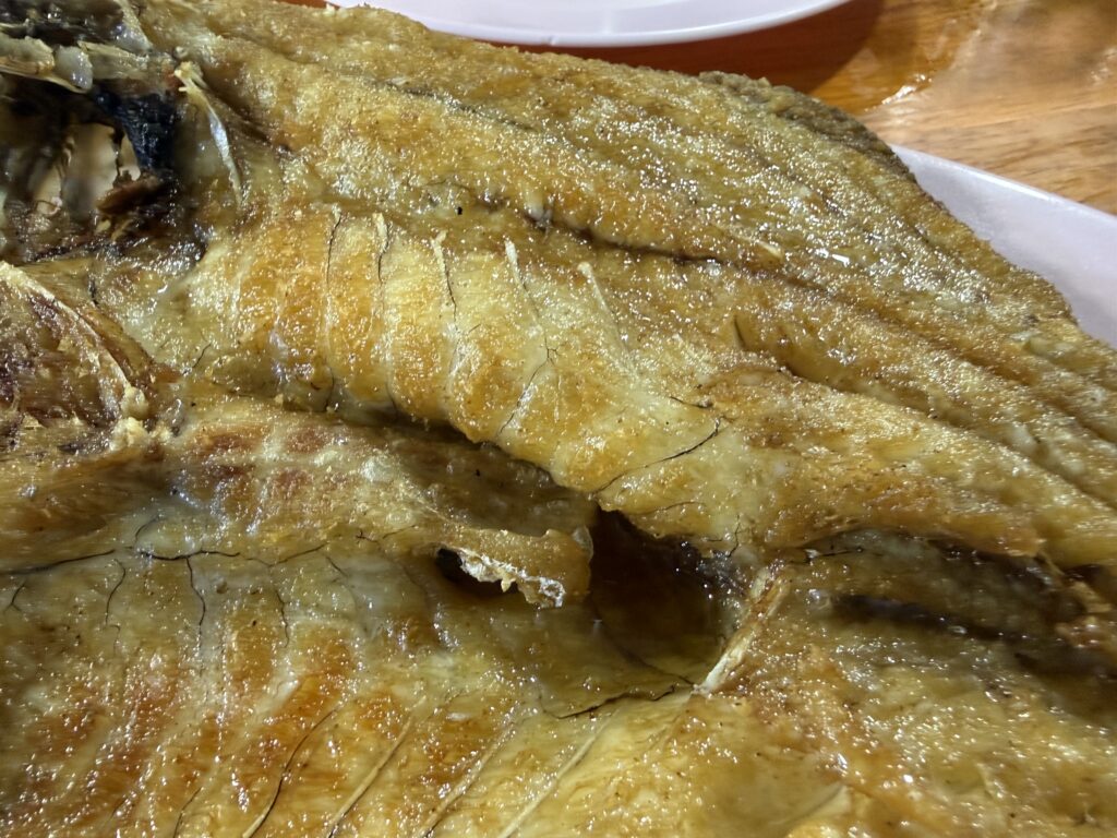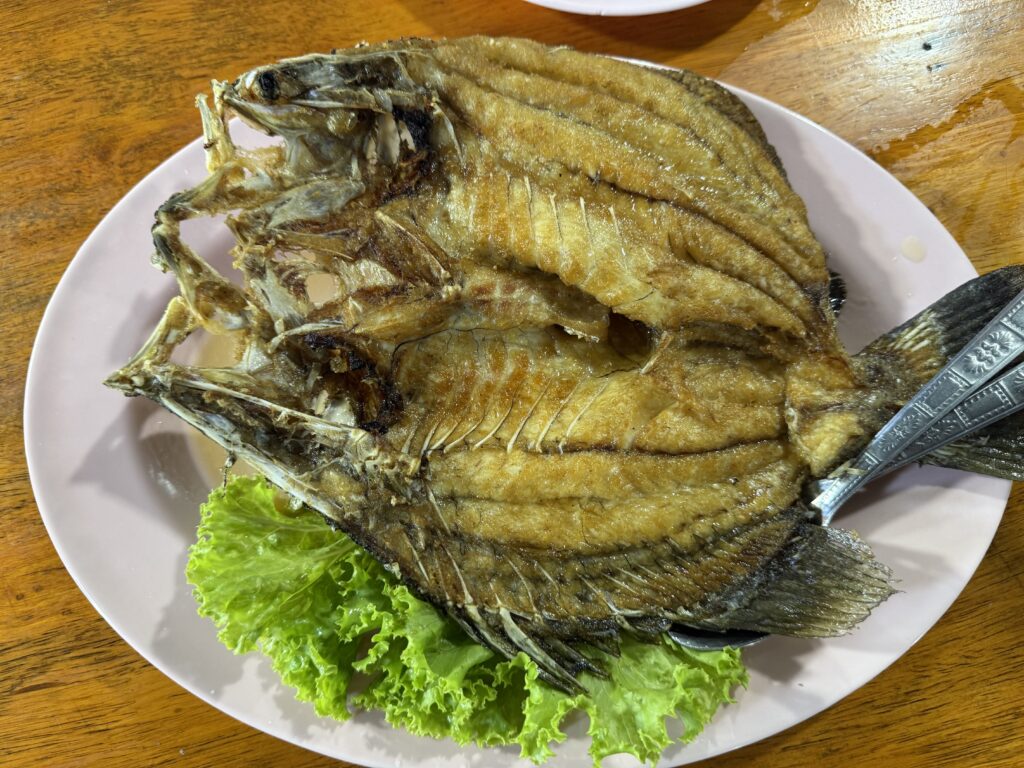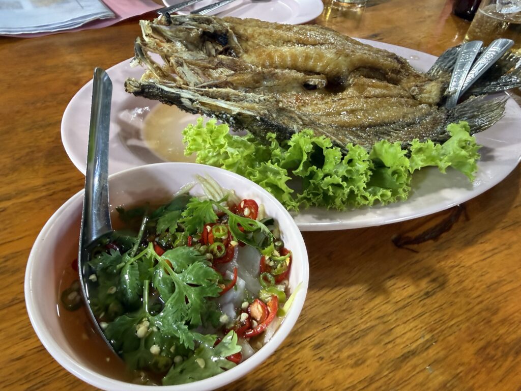 スズキの揚げ物ナンプラー掛けです。ソースとともにいただきます。