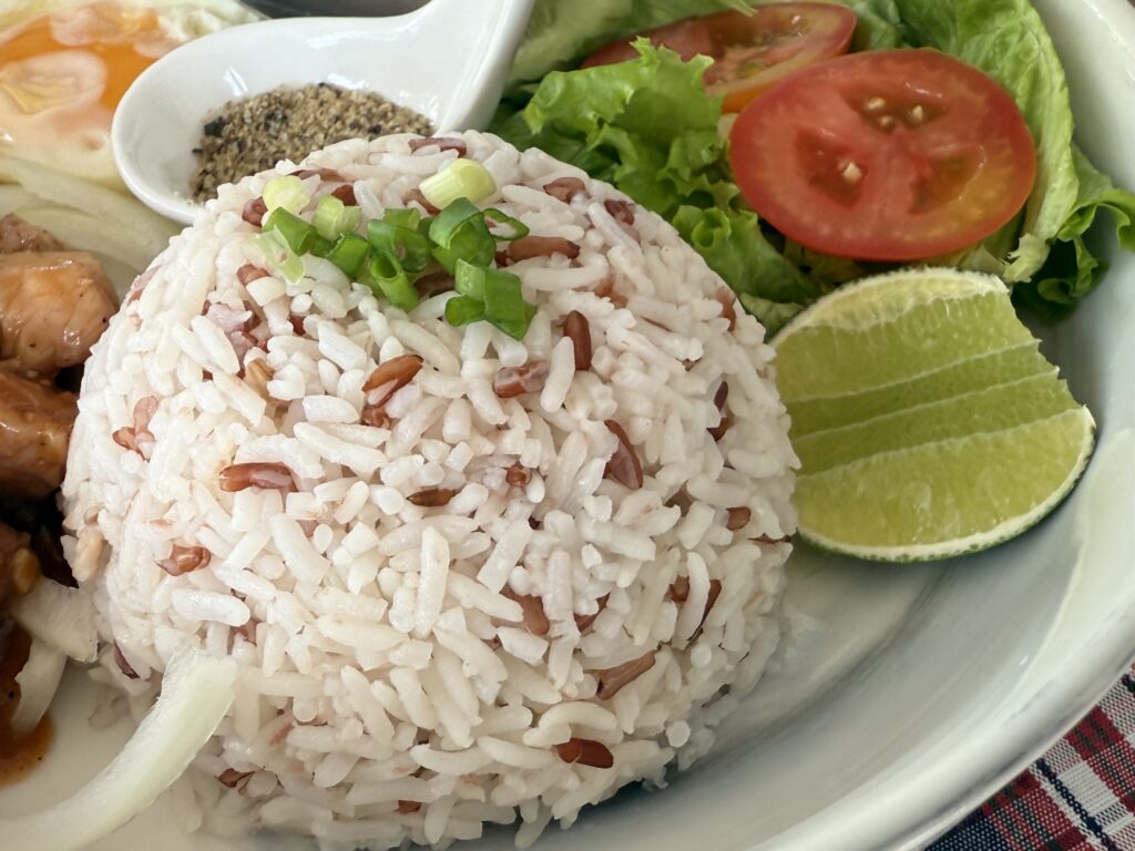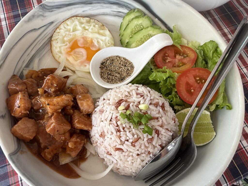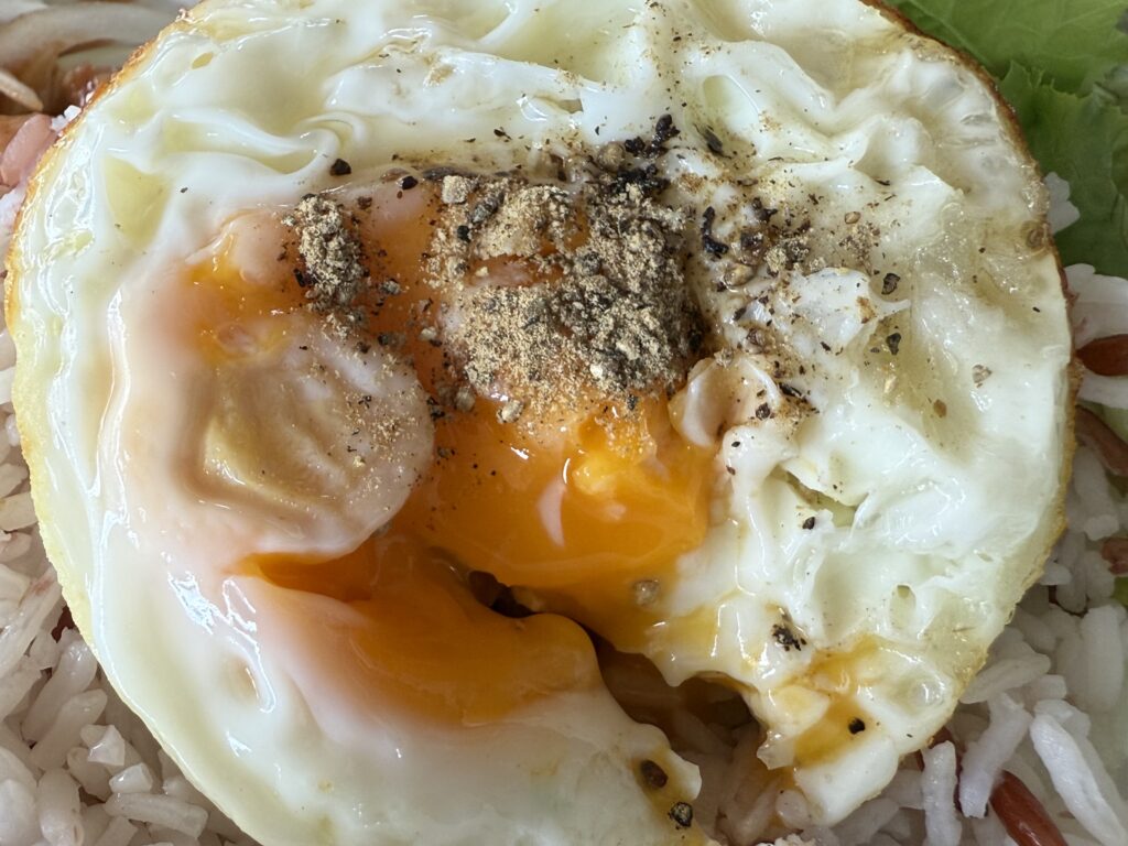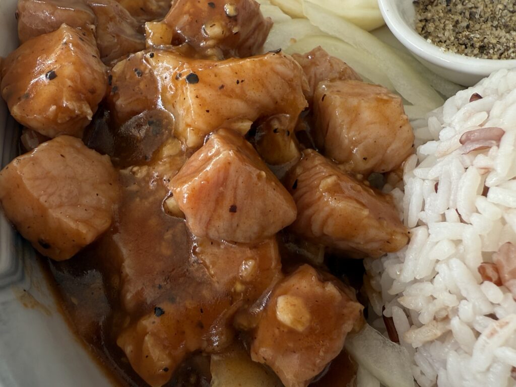 お肉は牛肉でサイコロステーキ状、そして甘めの味付け。このお店のロックラックのお肉はかたくなくて高評価