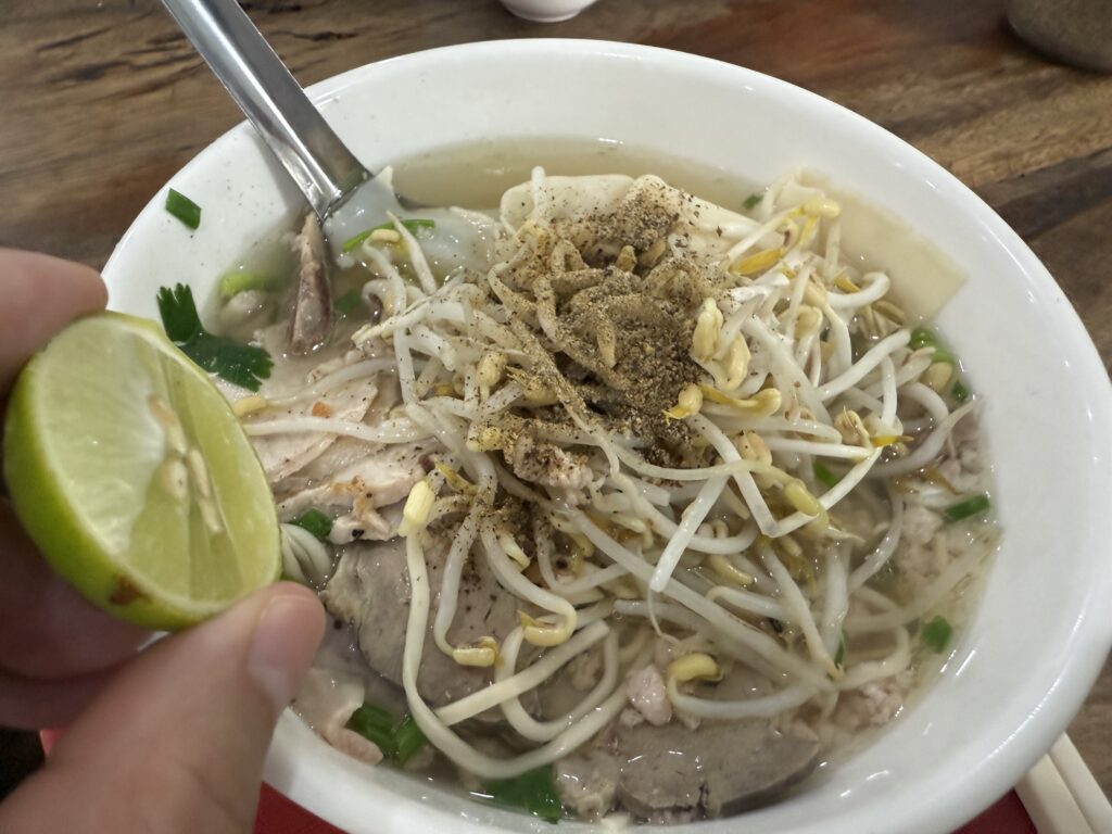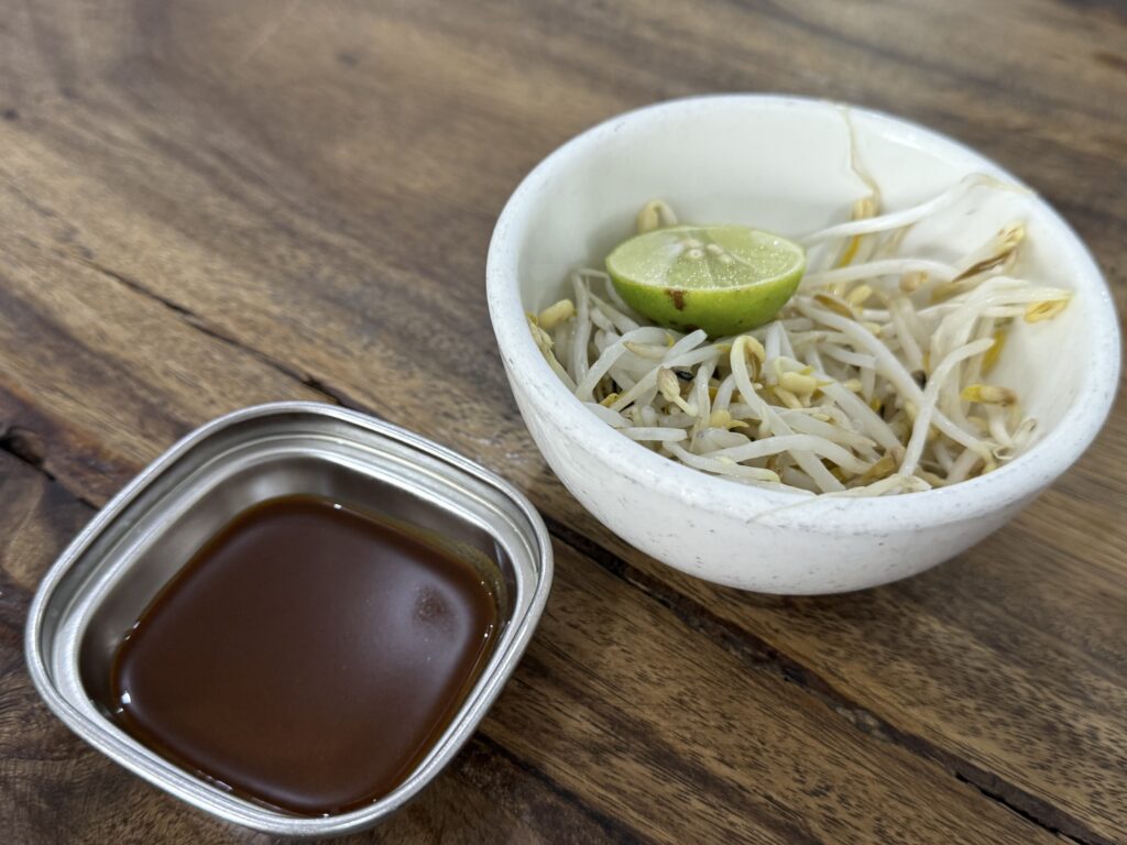 もやしを乗せて、胡椒を振り、ライムを絞るいつもの儀式