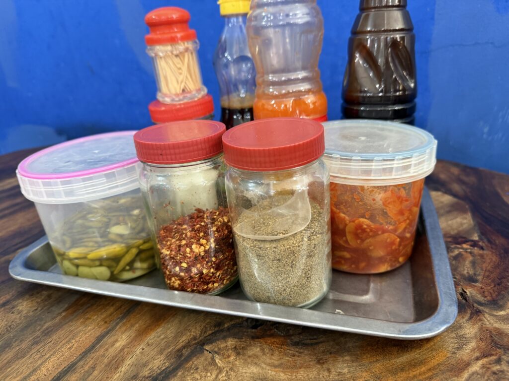 よく使うのは、挽いた黒胡椒と辛味にんにく、たまに唐辛子です。