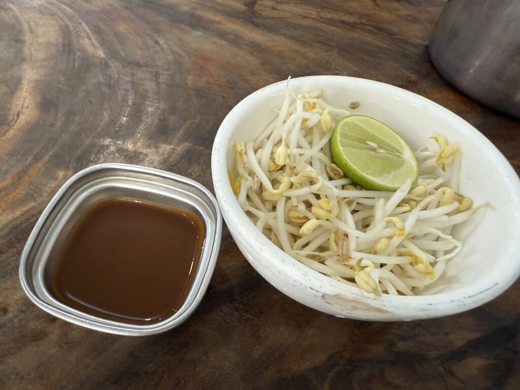 ここにもやしを全乗せして、胡椒と粉唐辛子を振り、ライムを絞る