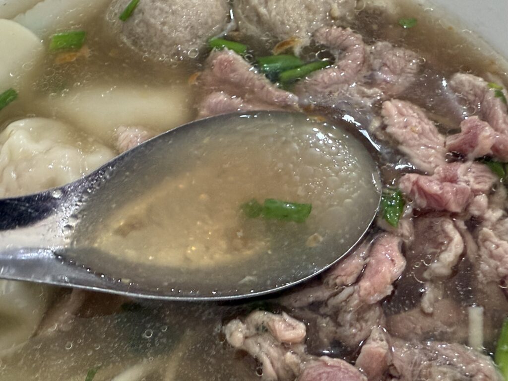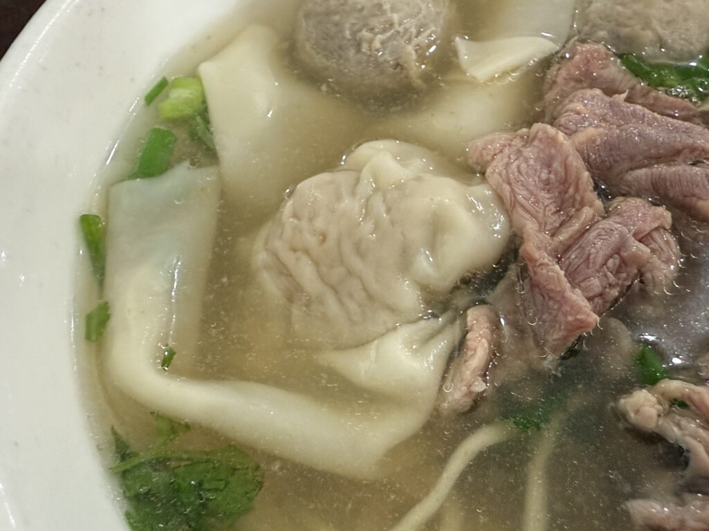 巨大ワンタン。牛肉麺の場合も、ワンタンの具は豚ひき肉です。