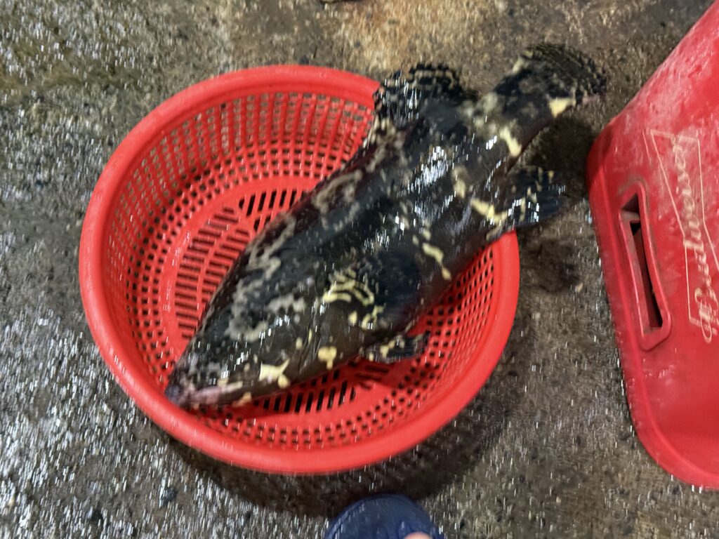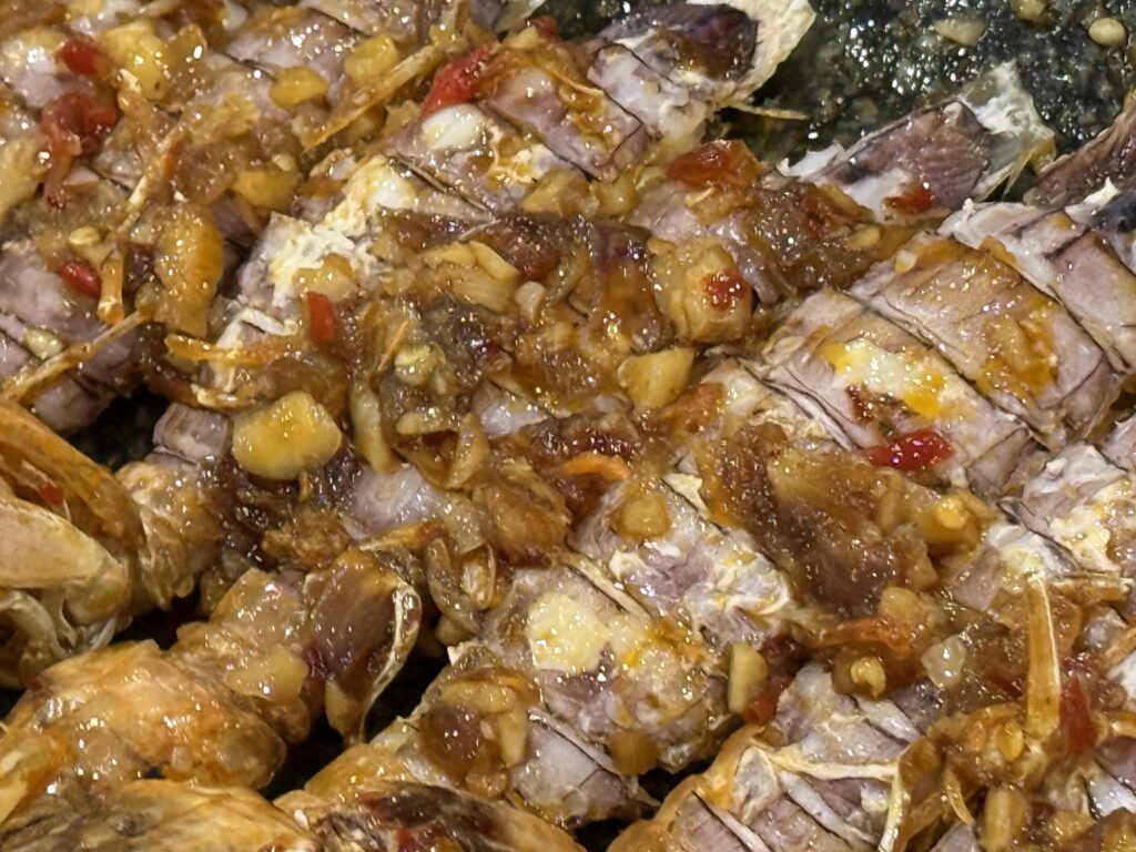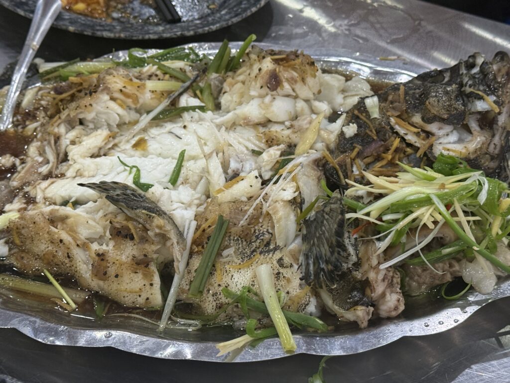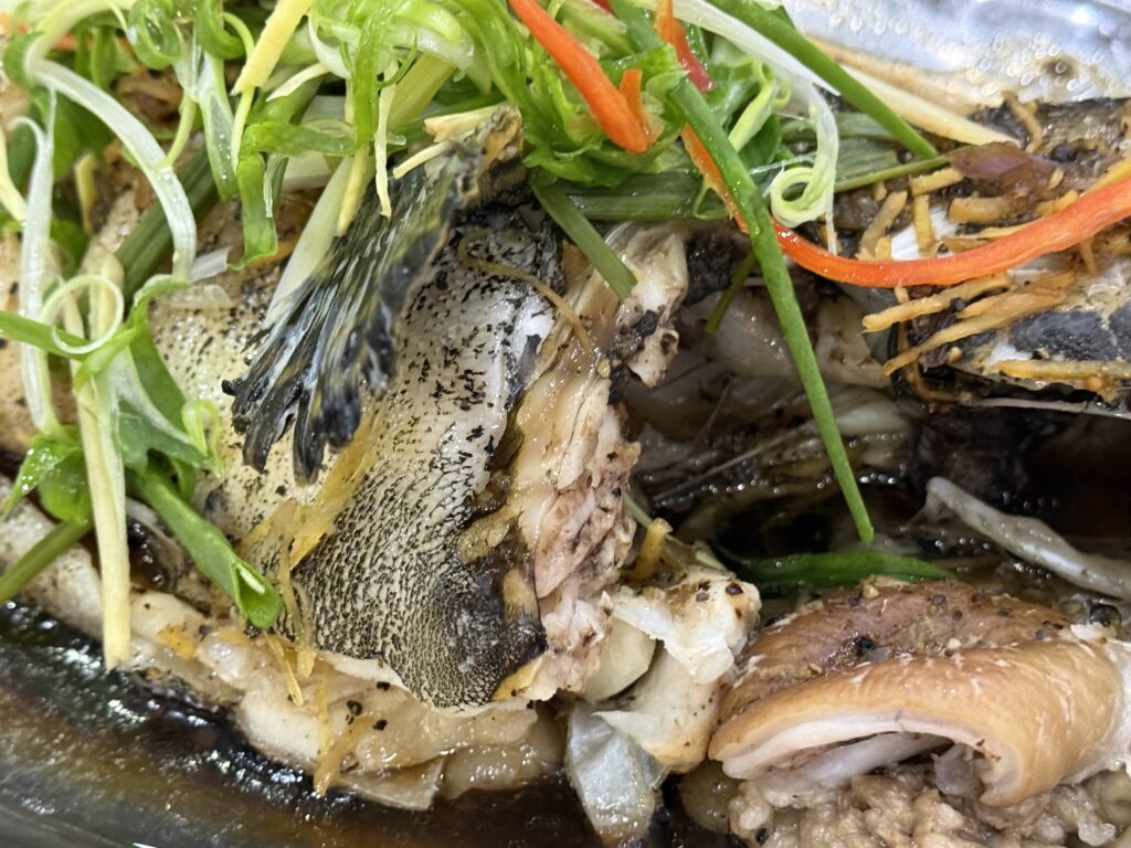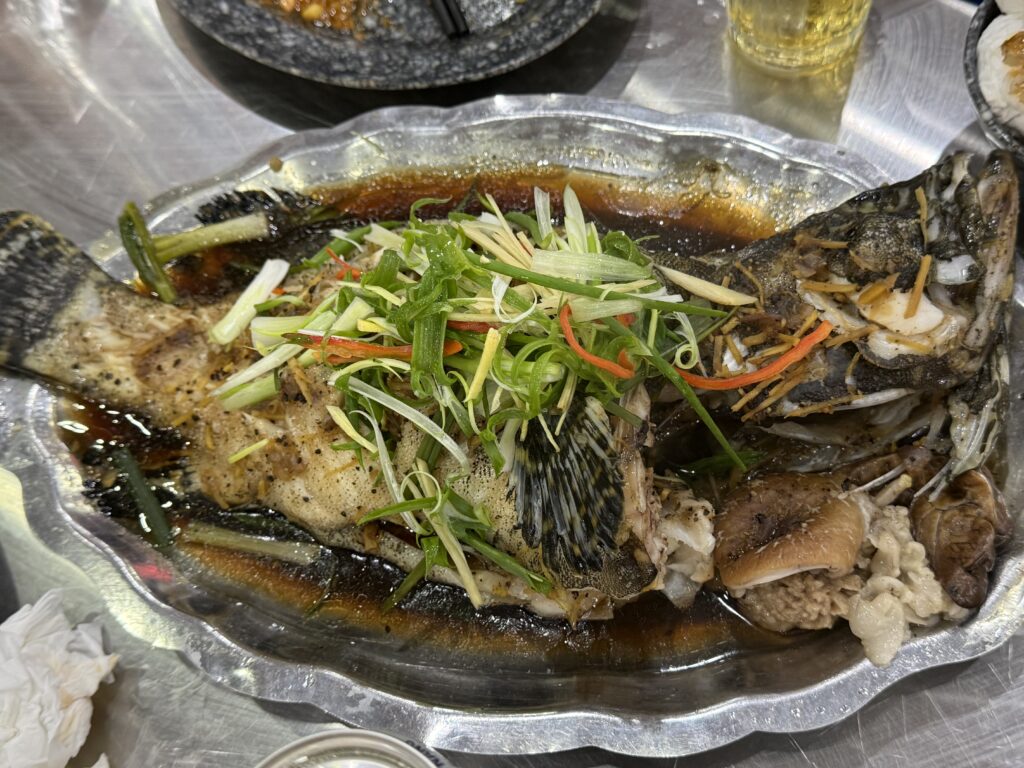 さっきまで活きていたお魚です。おいしそう〜。醤油蒸しです