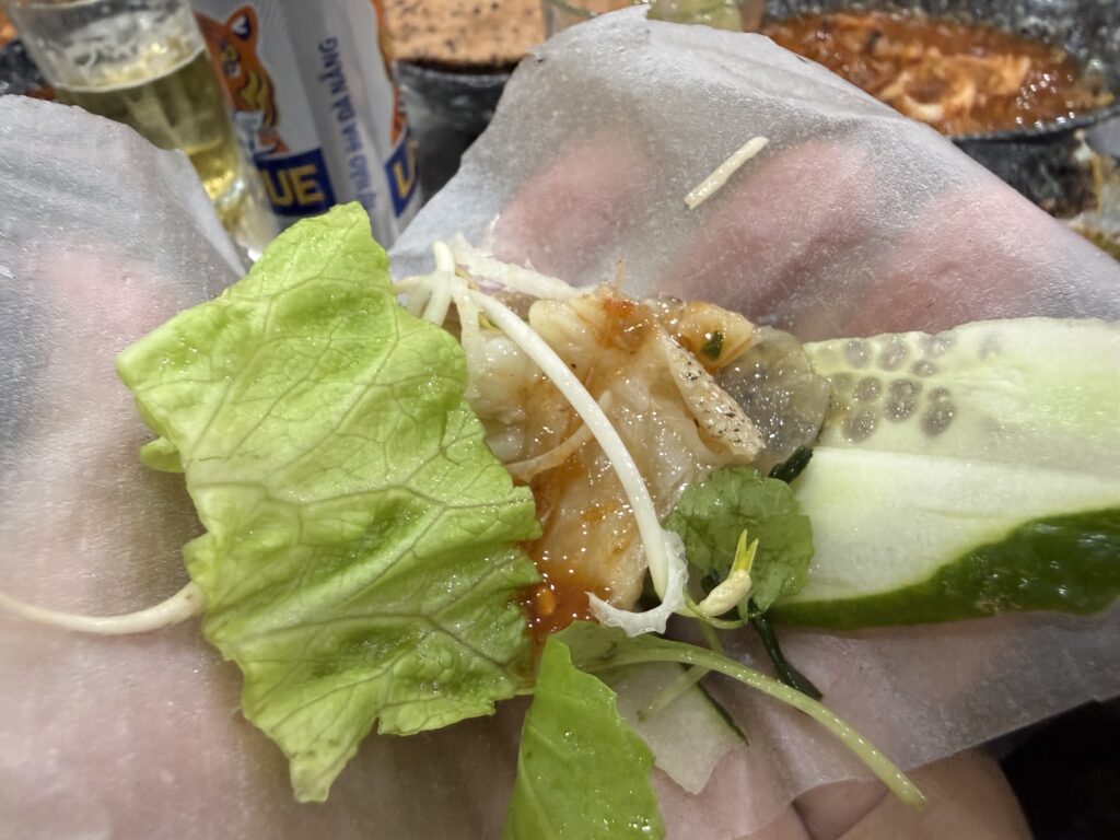 ライスペーパーに野菜とともに包んでいただいても美味。ハタはちょっと高かったけど、大正解
