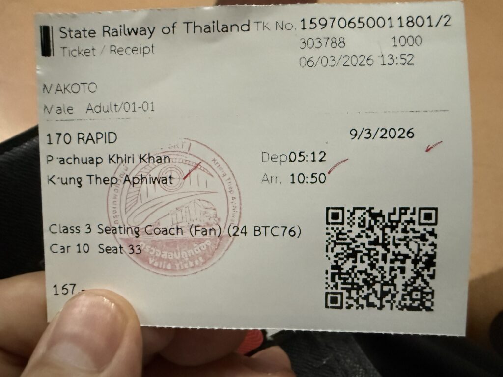 クルンテープアピワット駅で購入しておいた乗車券 バンコクまでわずか157バーツ