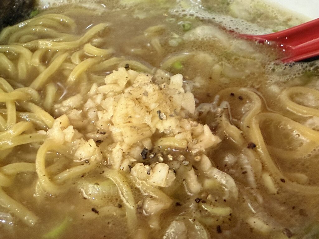刻みニンニクをトッピングして味変します。まあ普通においしくいたただけるラーメンでした。