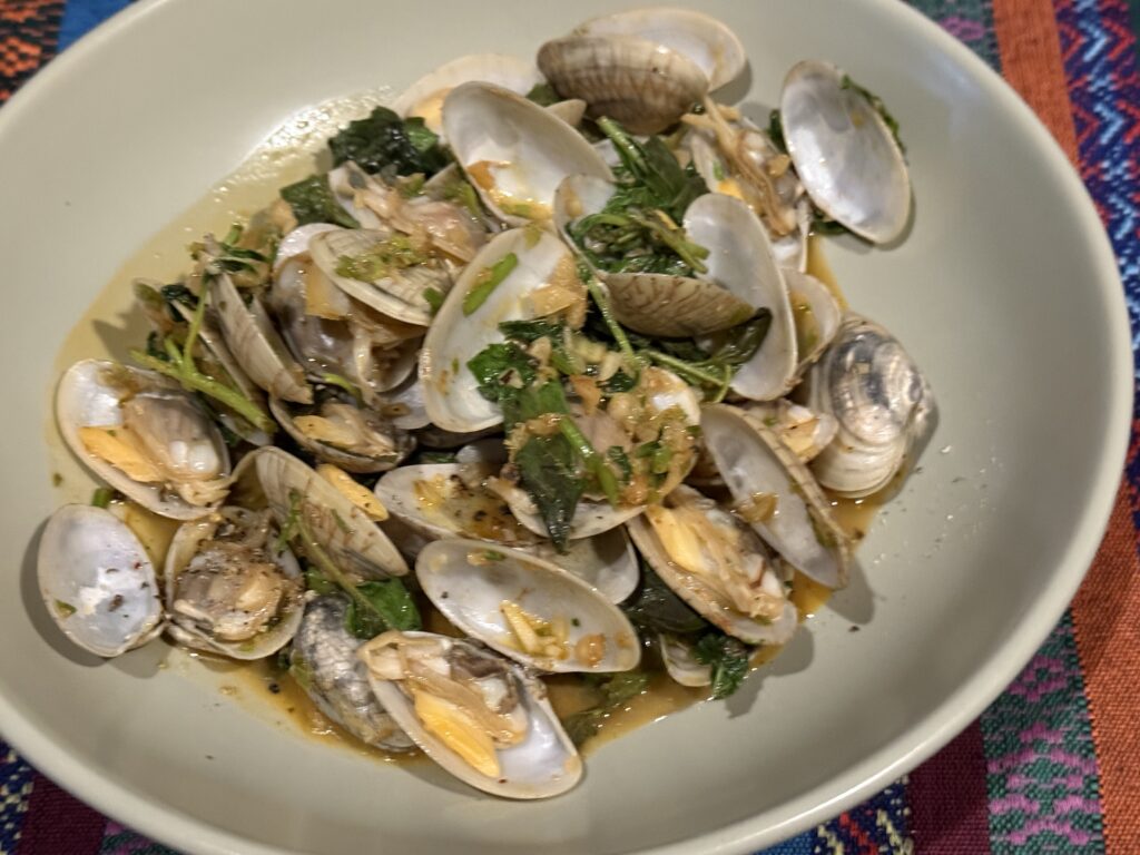 タイのアサリのガパオ炒めです。味付けはタイのチリインオイルのナムプリックパオ