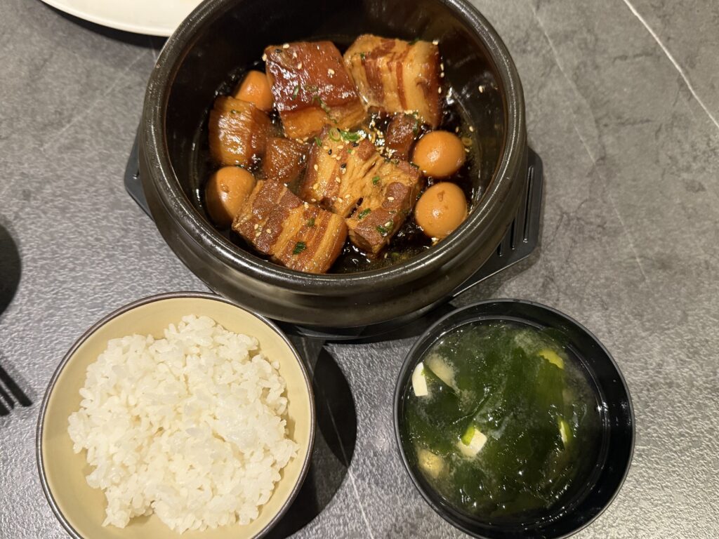 ご飯もよそってこちらが豚の角煮定食になりました。角煮は軟らかく煮込まれていて、味もOK。でも豚肉の量が多すぎた。豚の角煮は定食のメイン料理ではないなってのが感想