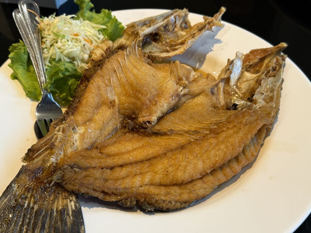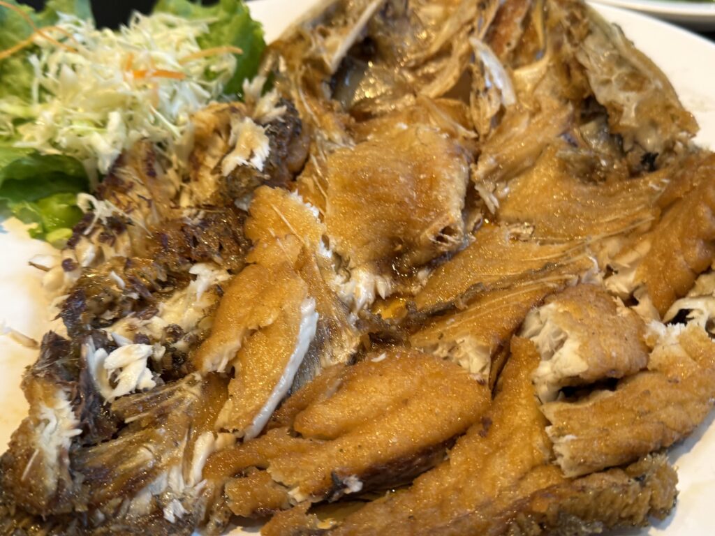 カリカリに揚がっていますが、一昨日食べたセンチャイの方が、美味しかった。昨日のは白身がふわふわだったなー。