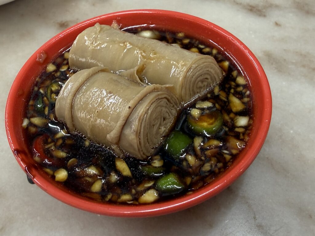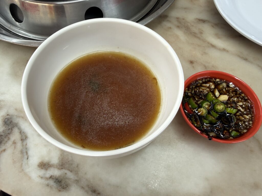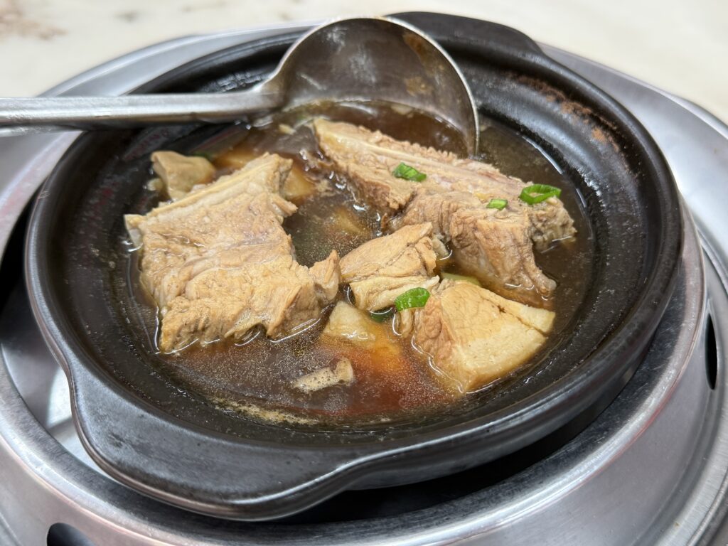 まずは肉骨茶スープを楽しみます。色の濃い、ちょっと漢方がかったスープ