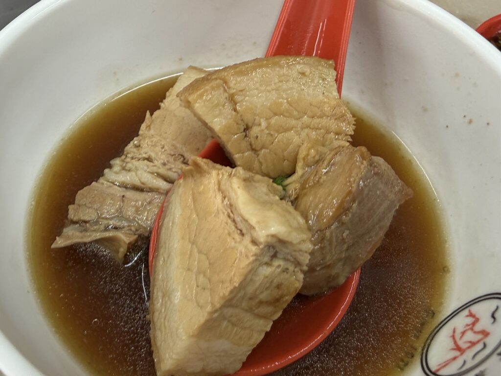 柔らかく煮込まれた豚肉が3つ4つ入っています