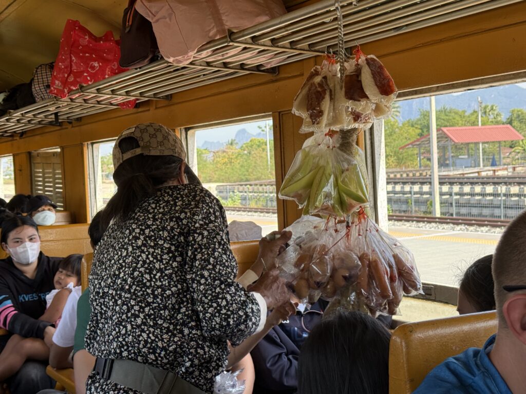 年末ということもありかなり混雑していましたが、途中で着席できました。これは網棚につりさげるスタイルの物売り