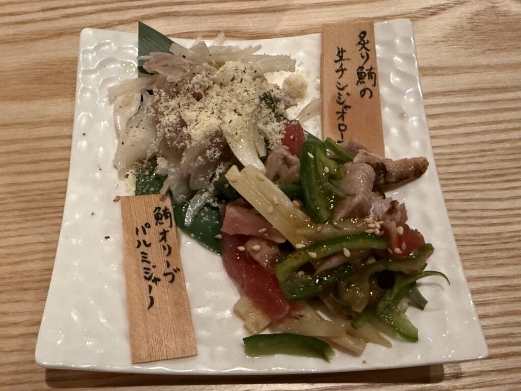 炙り鮪の生チンジャオロースーと鮪オリーブパルミジャーノ