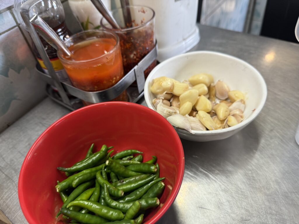 テーブルの唐辛子とにんにく。日本では見られない光景です