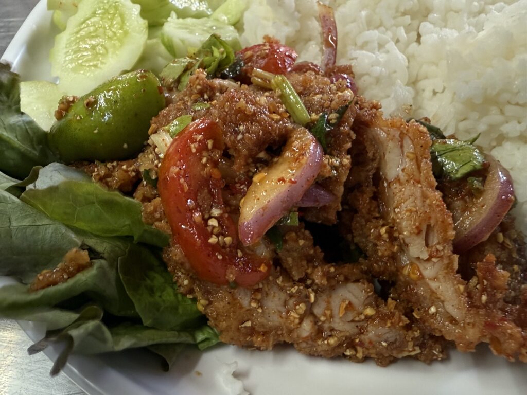 スライスしたフライドチキンをハーブと野菜で和えたものが、ヤムガイセーブです。非常に辛い鶏肉の和え物料理で、パンチが効いています。