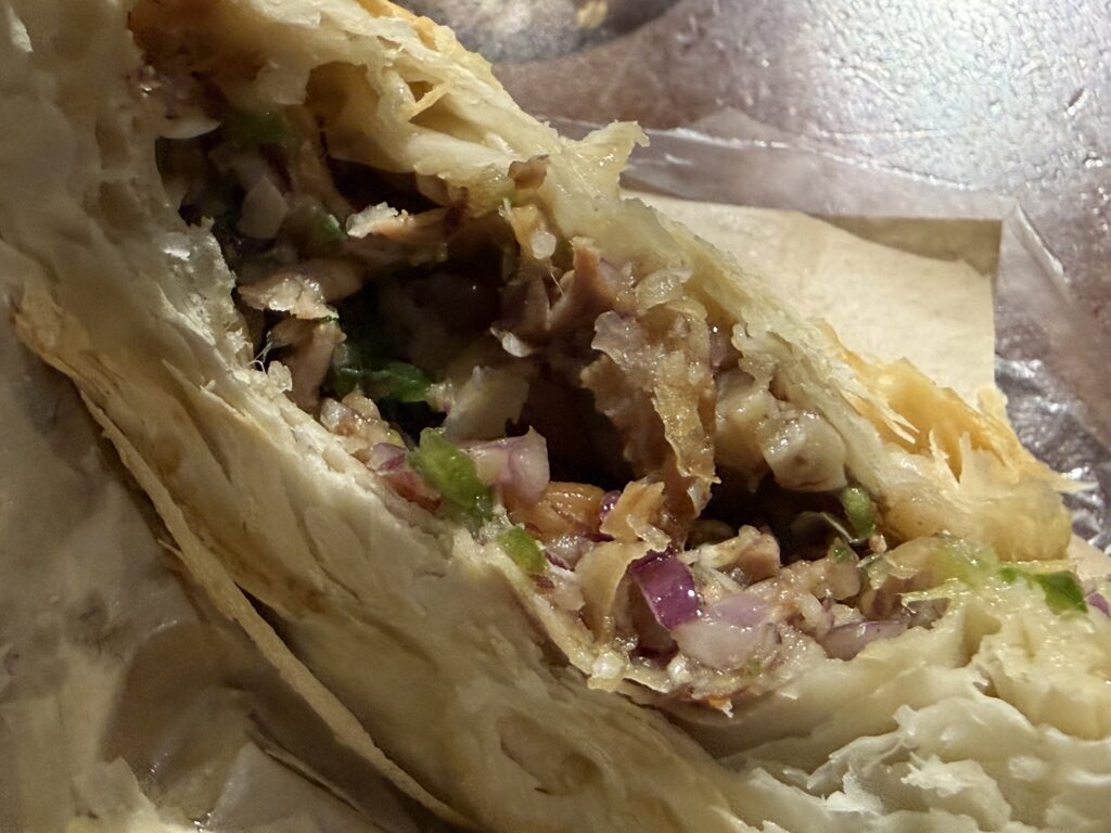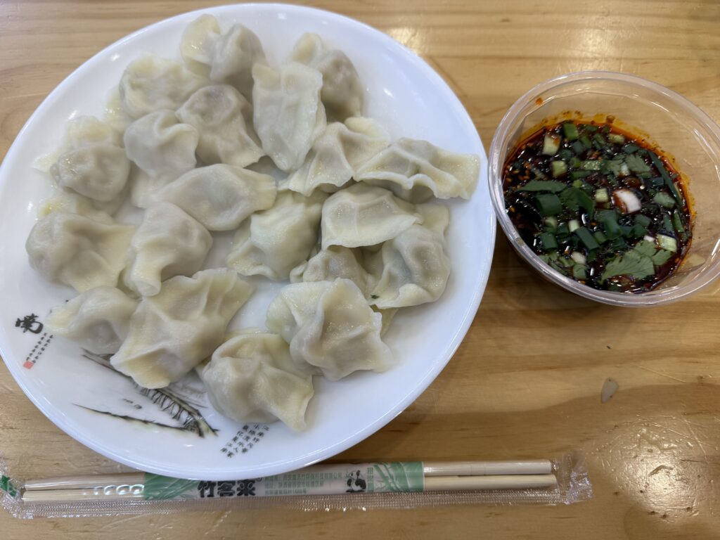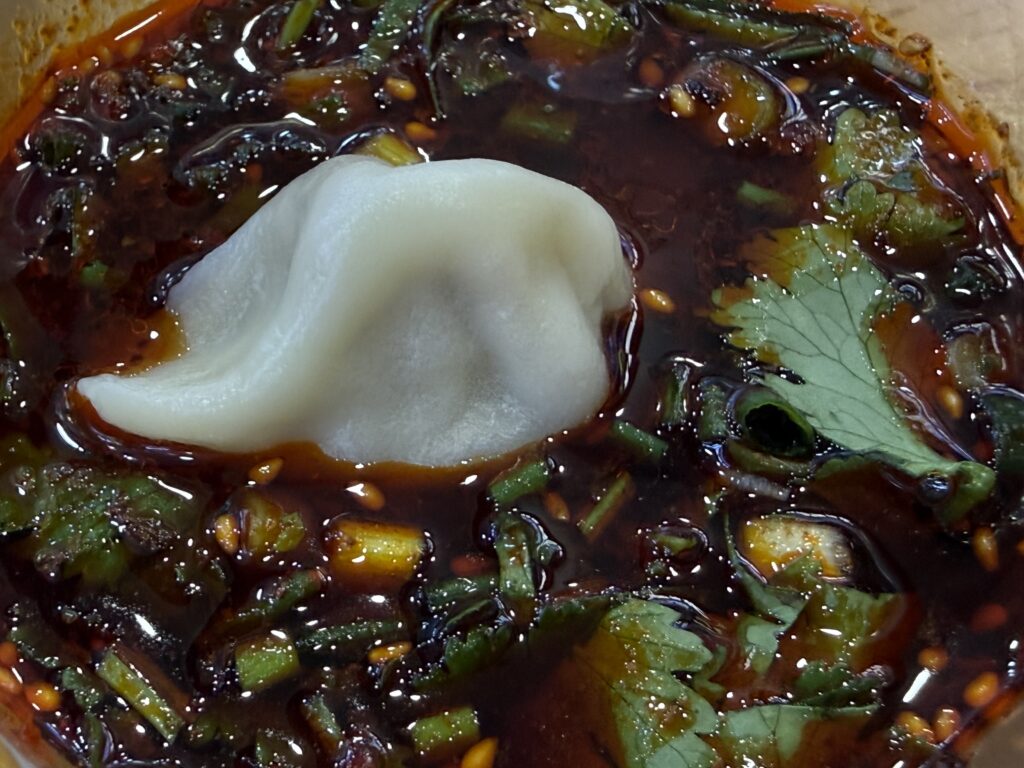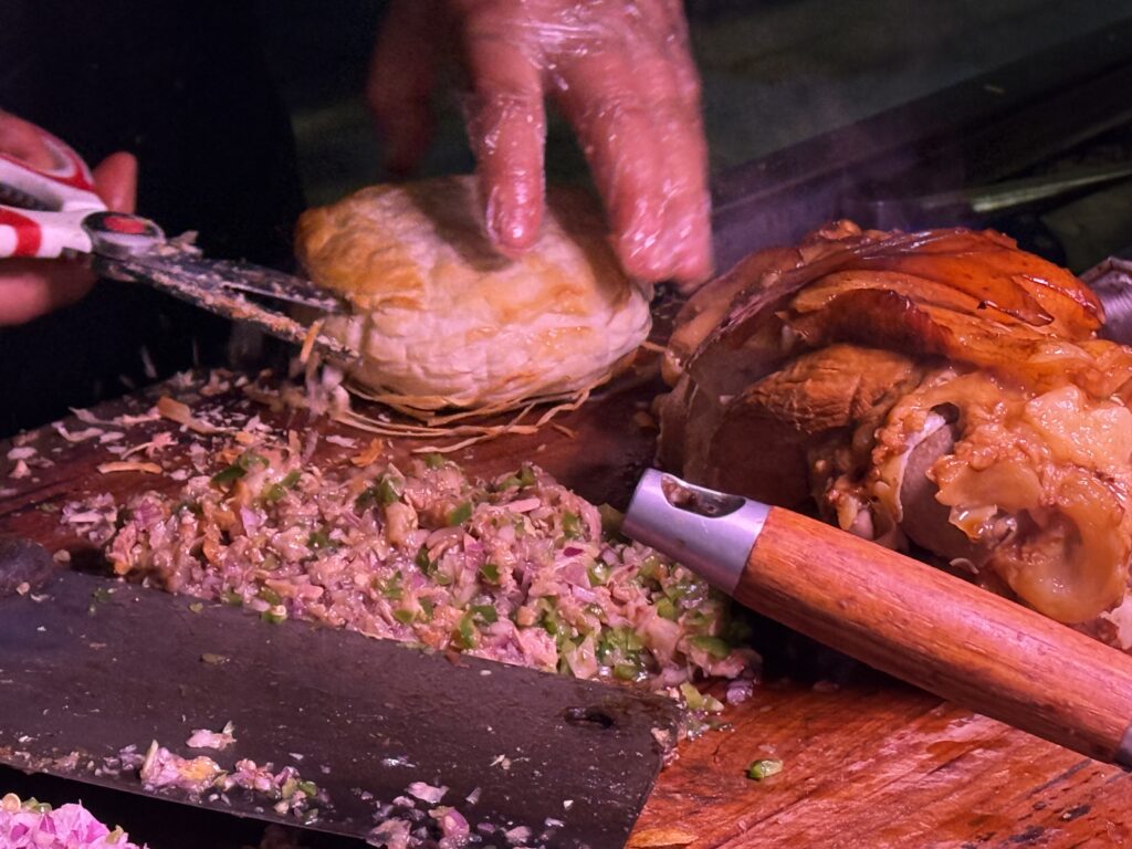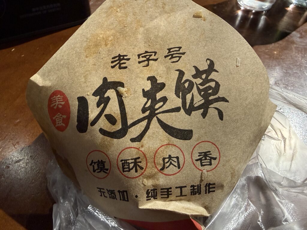 半発酵の焼きパン「馍」に、甘辛く煮込んだ肉や野菜を挟んだ料理です。パンがさくさくでおいしく、肉や野菜を受け止めます。