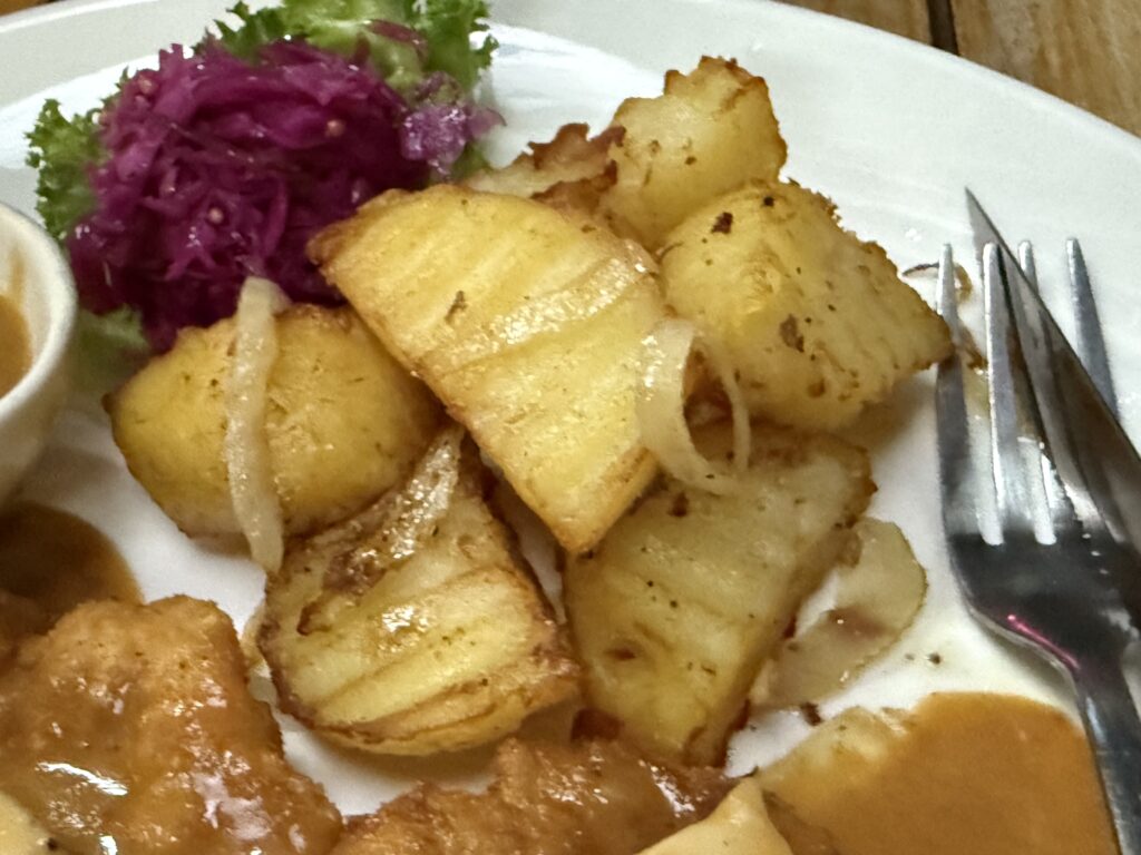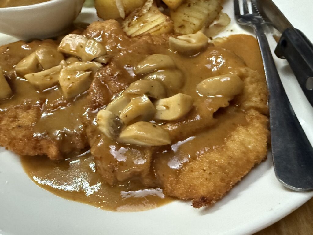 これはソースがかけられていて、シュニッツェル自体がパリッとしていないのが残念